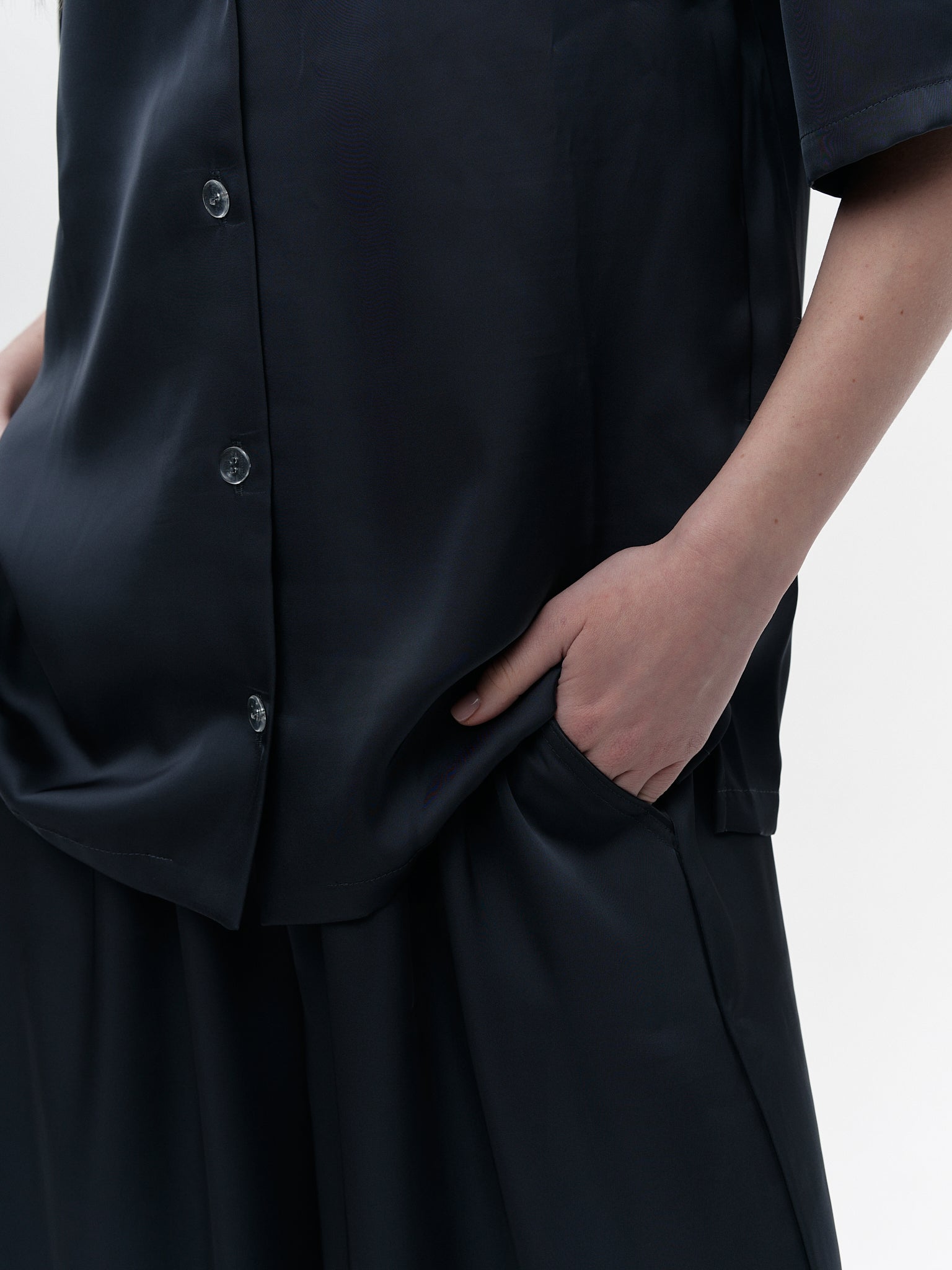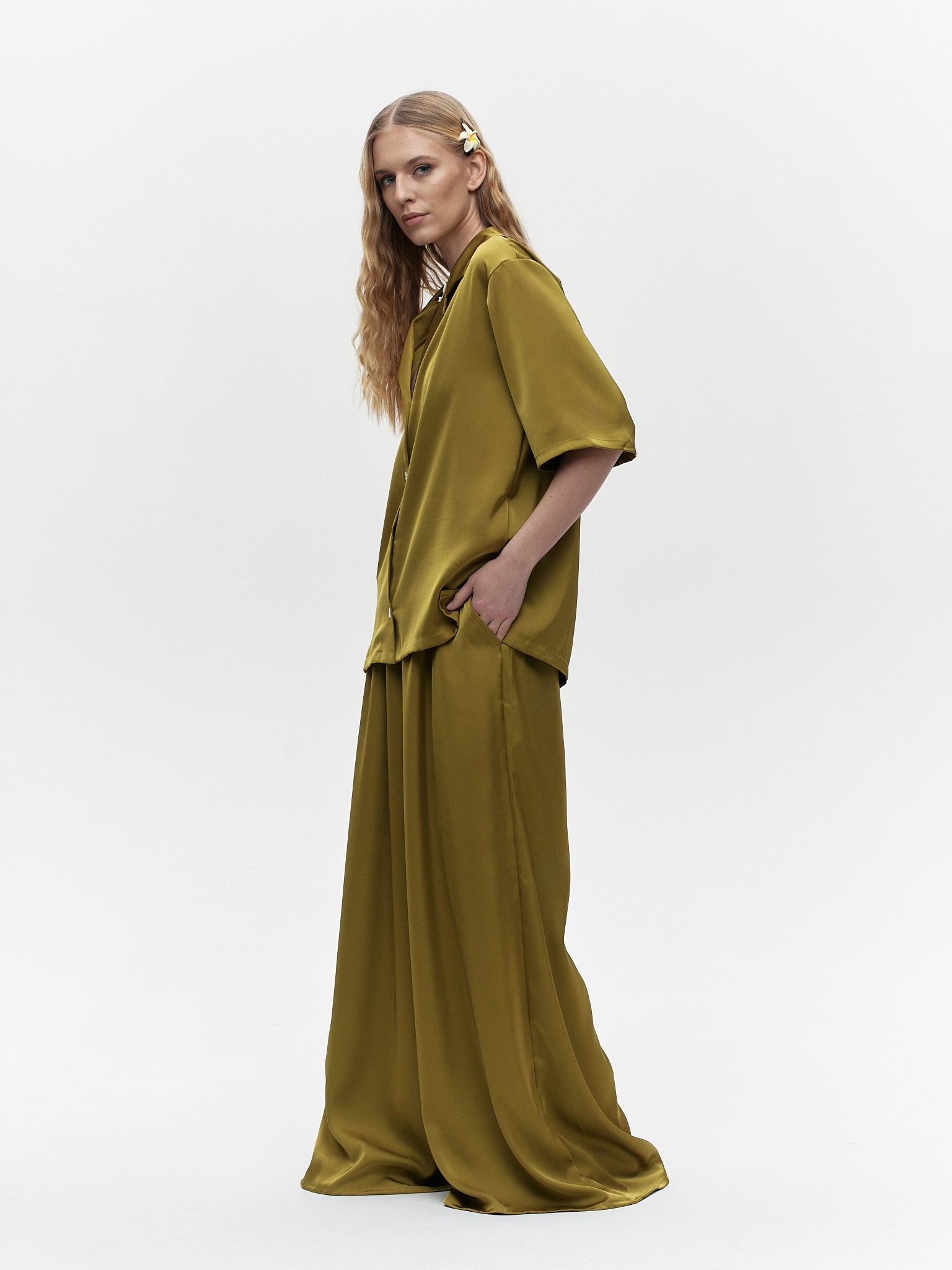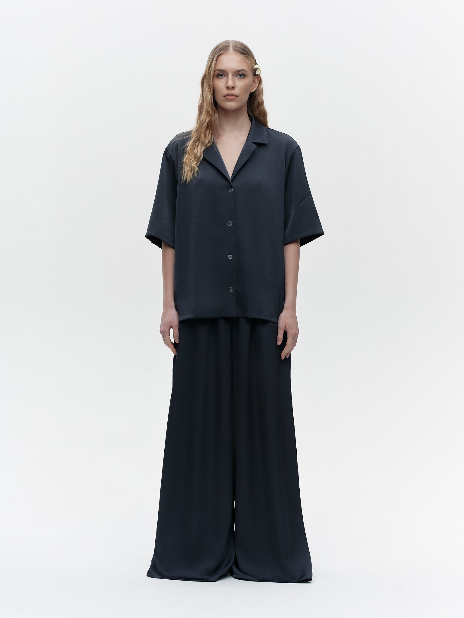 Experience ultimate comfort and elegance with our "Tenderness of touch" suit. Made from 100% silk, this suit features a short sleeved shirt and palazzo trousers, providing both style and breathability. Available in a variety of colors to suit your personal taste.