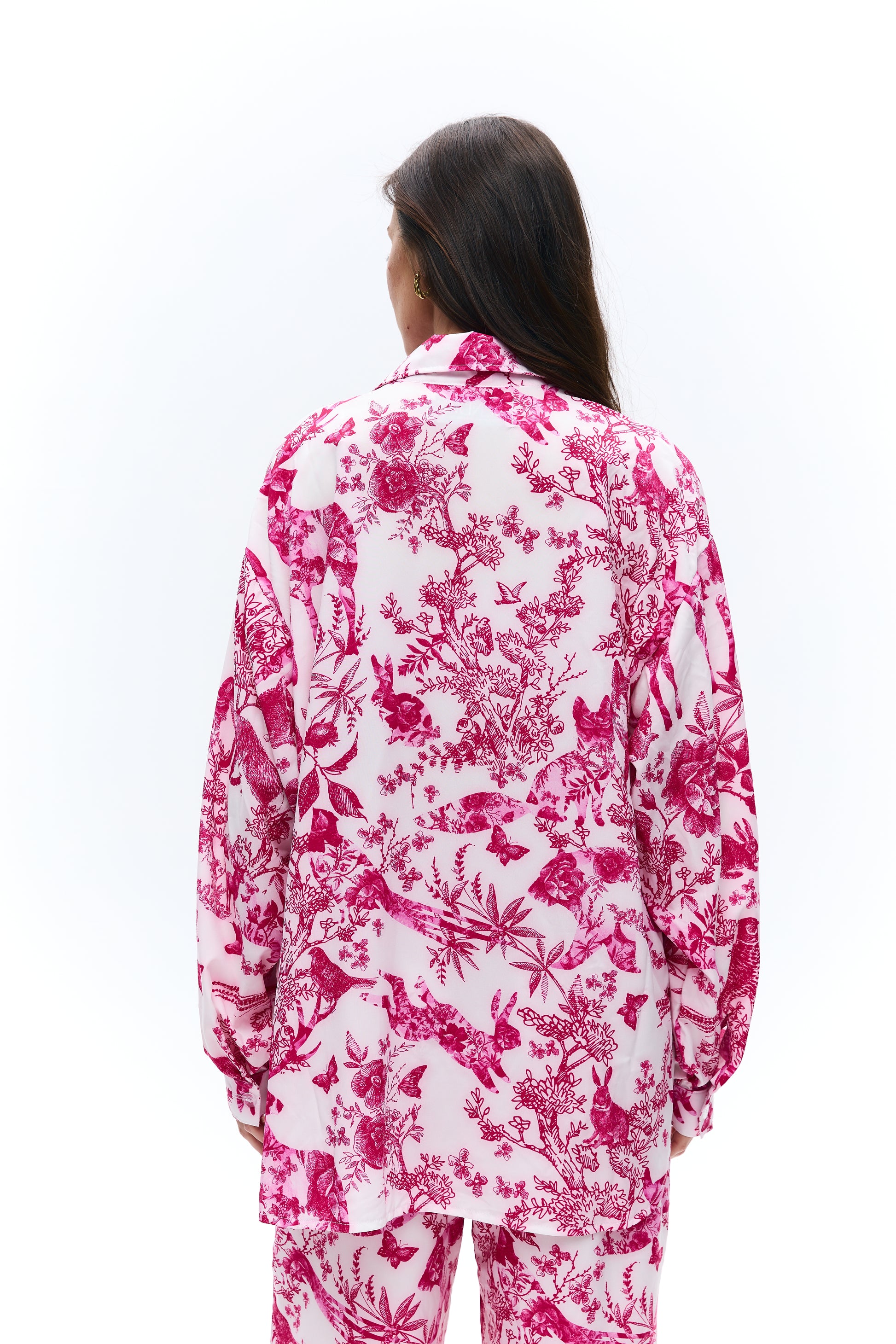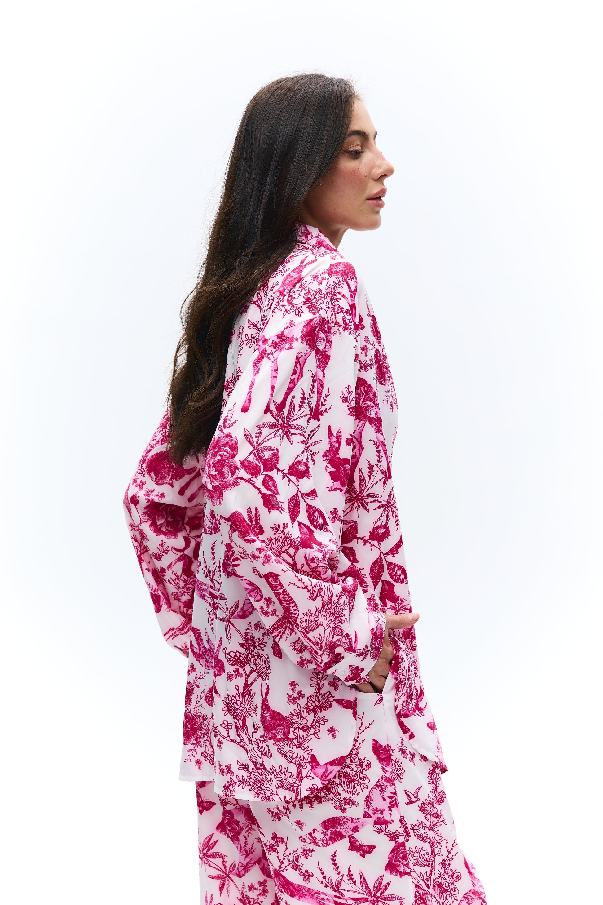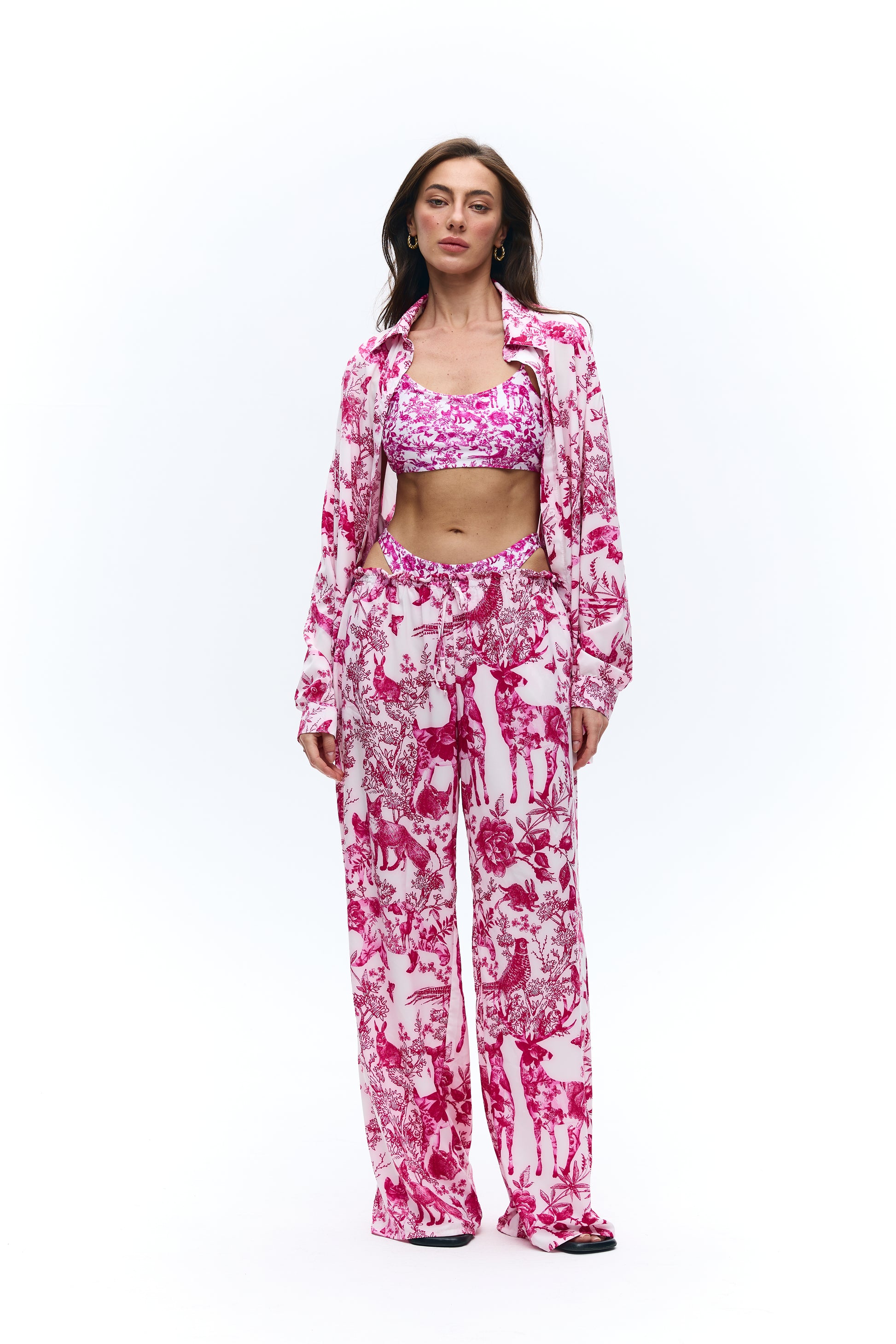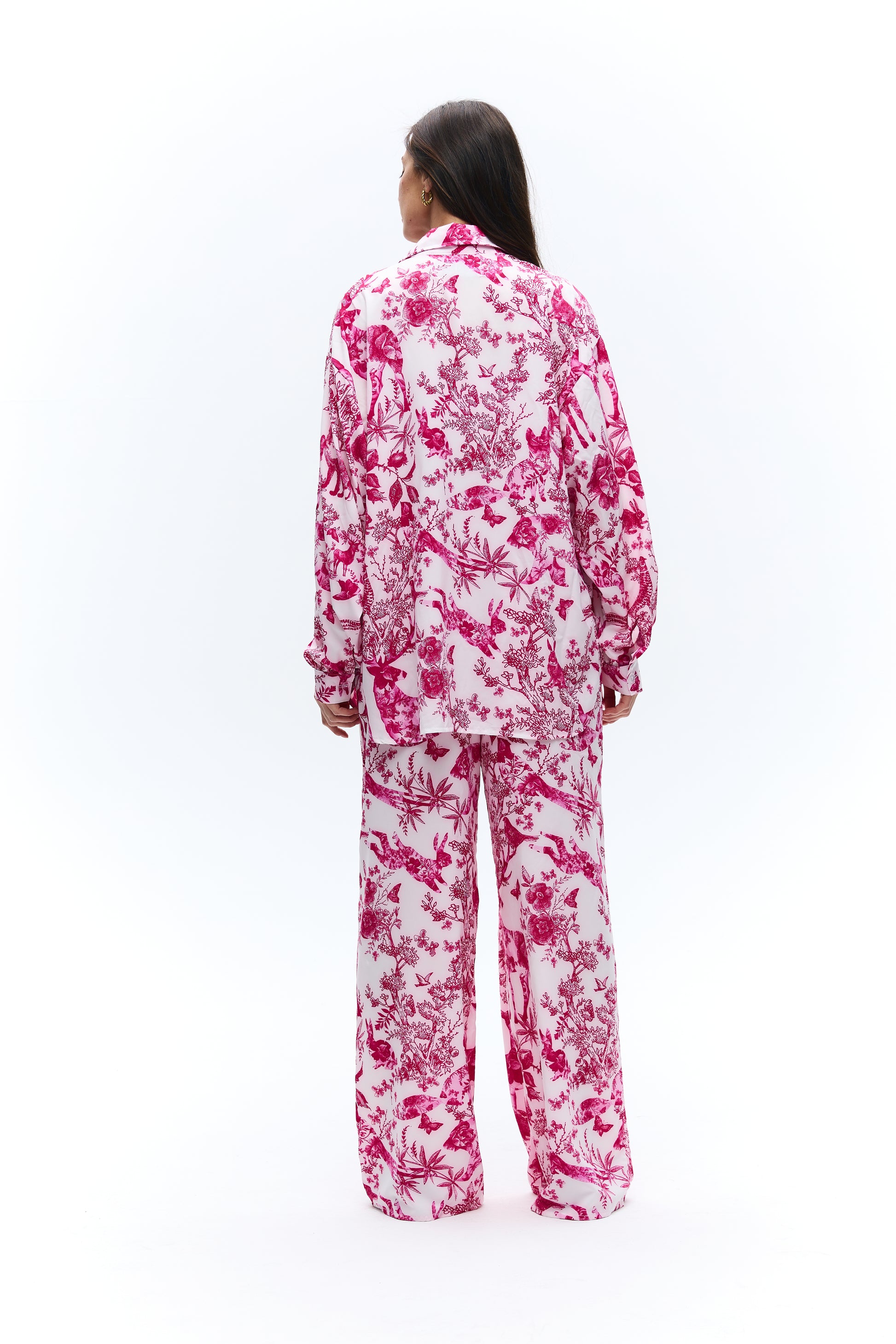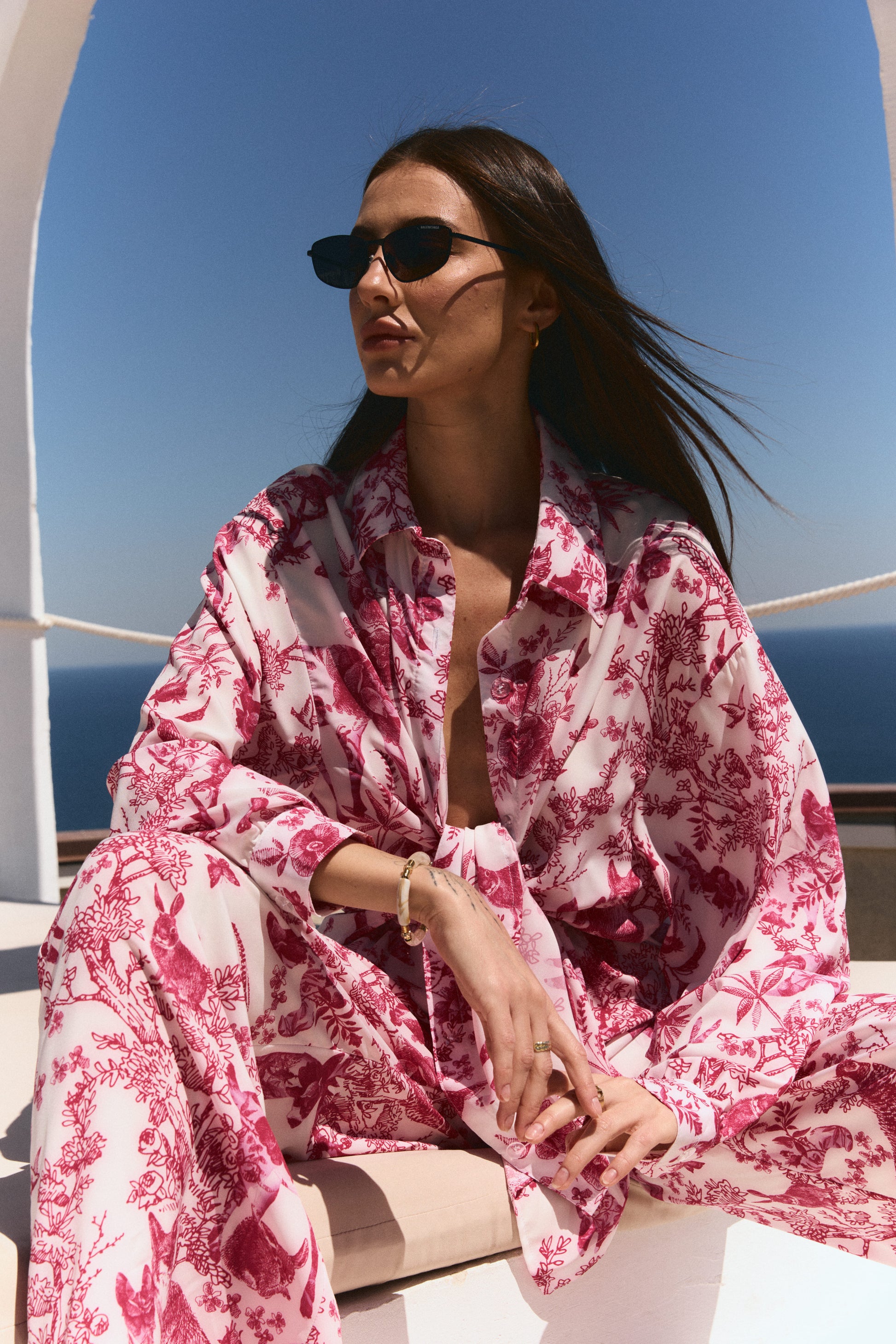 A suit in an author's eco-silk print with an oversized shirt and straight trousers will give any event a special charm and emphasize your exclusive style.