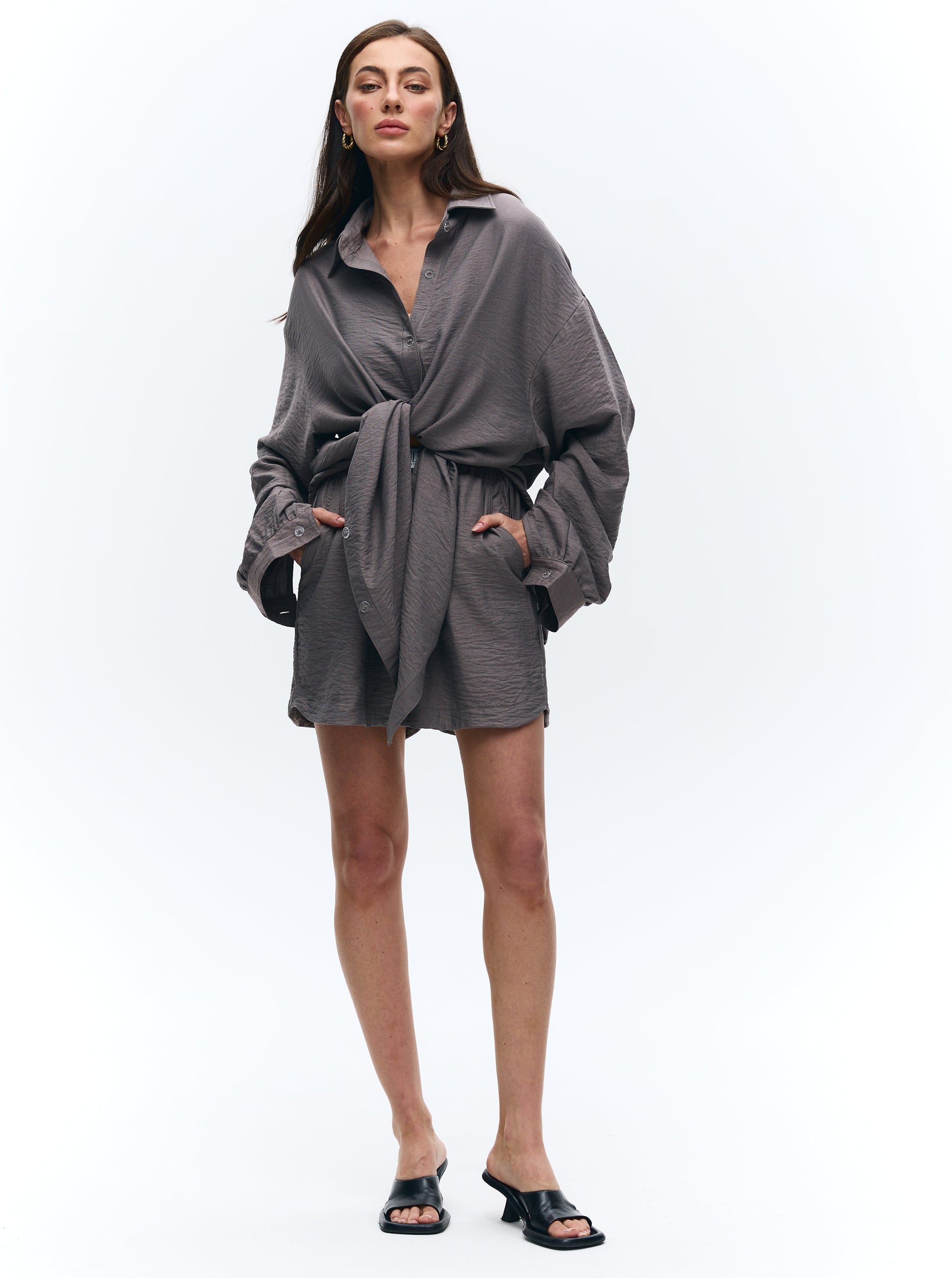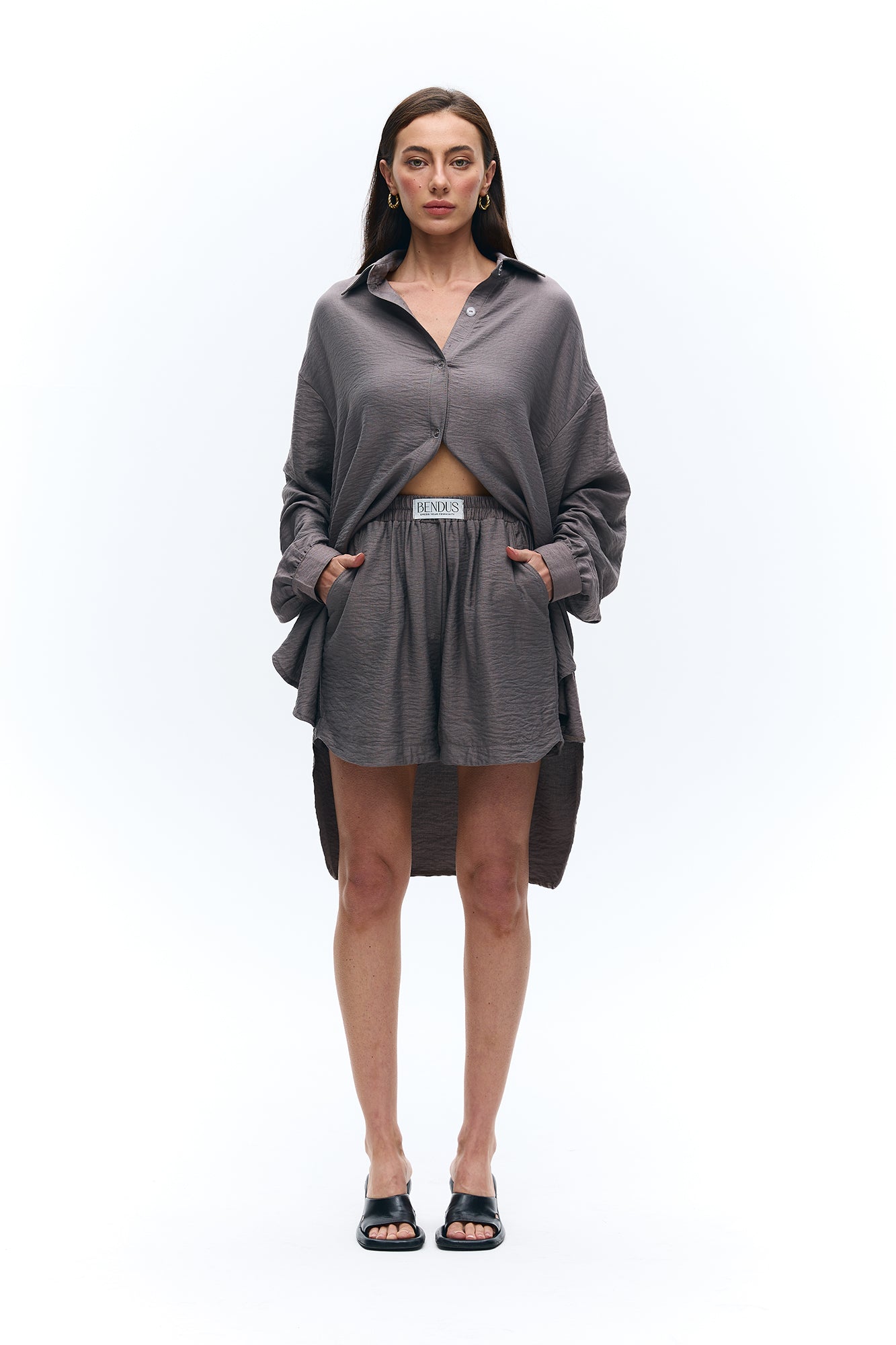 A linen suit with a long shirt and high-waisted shorts gives a feeling of elegance and lightness in every movement.